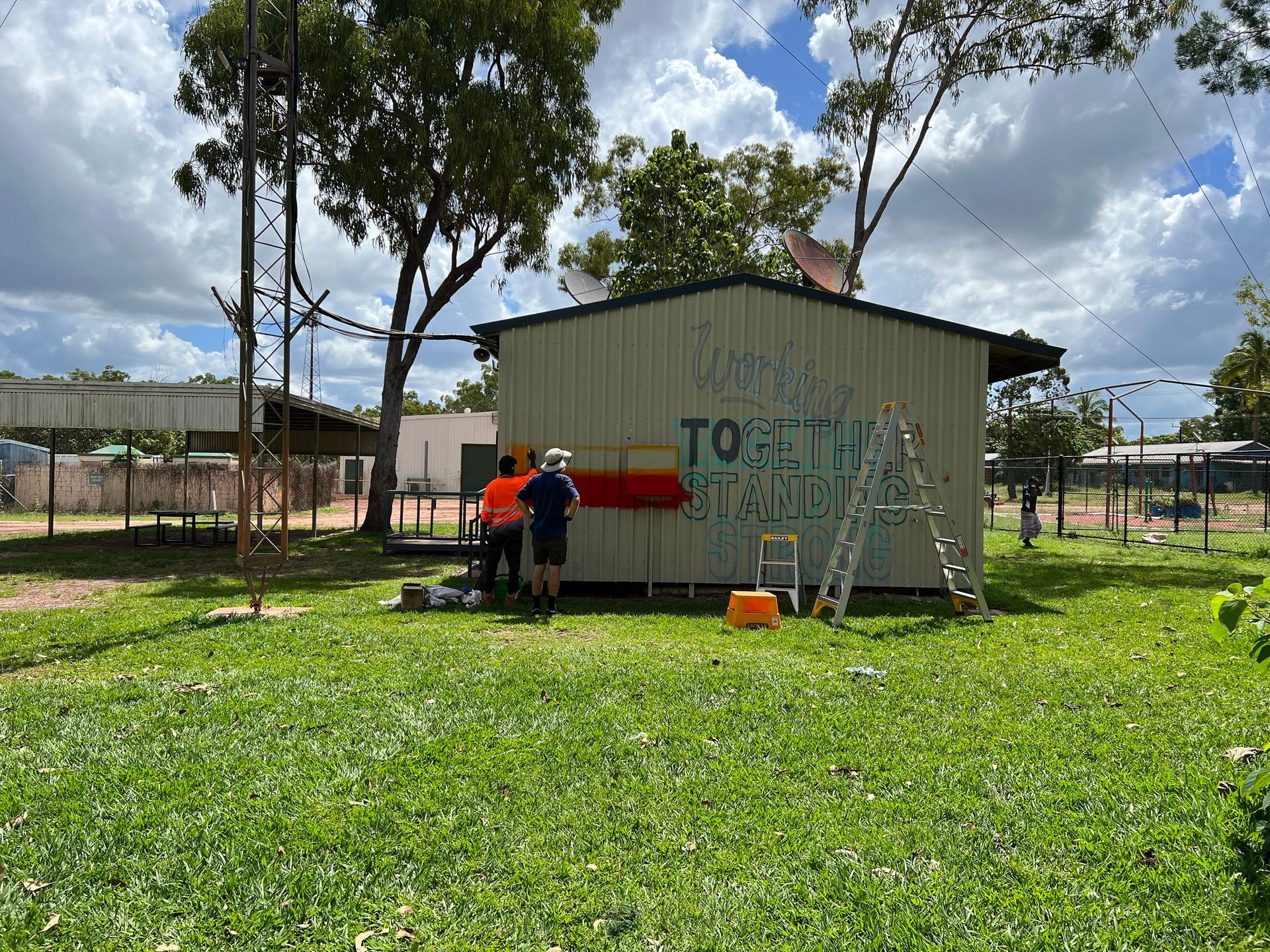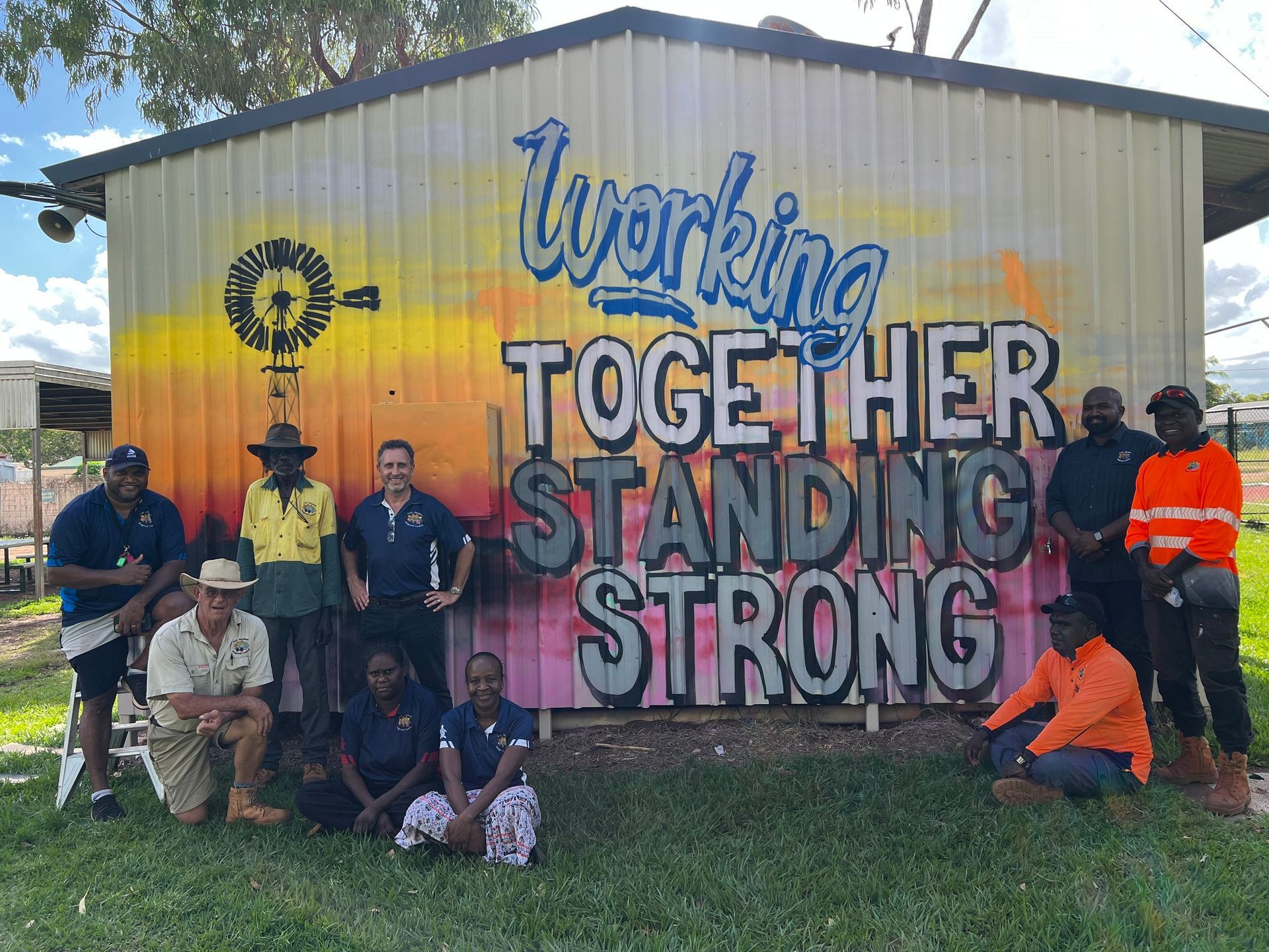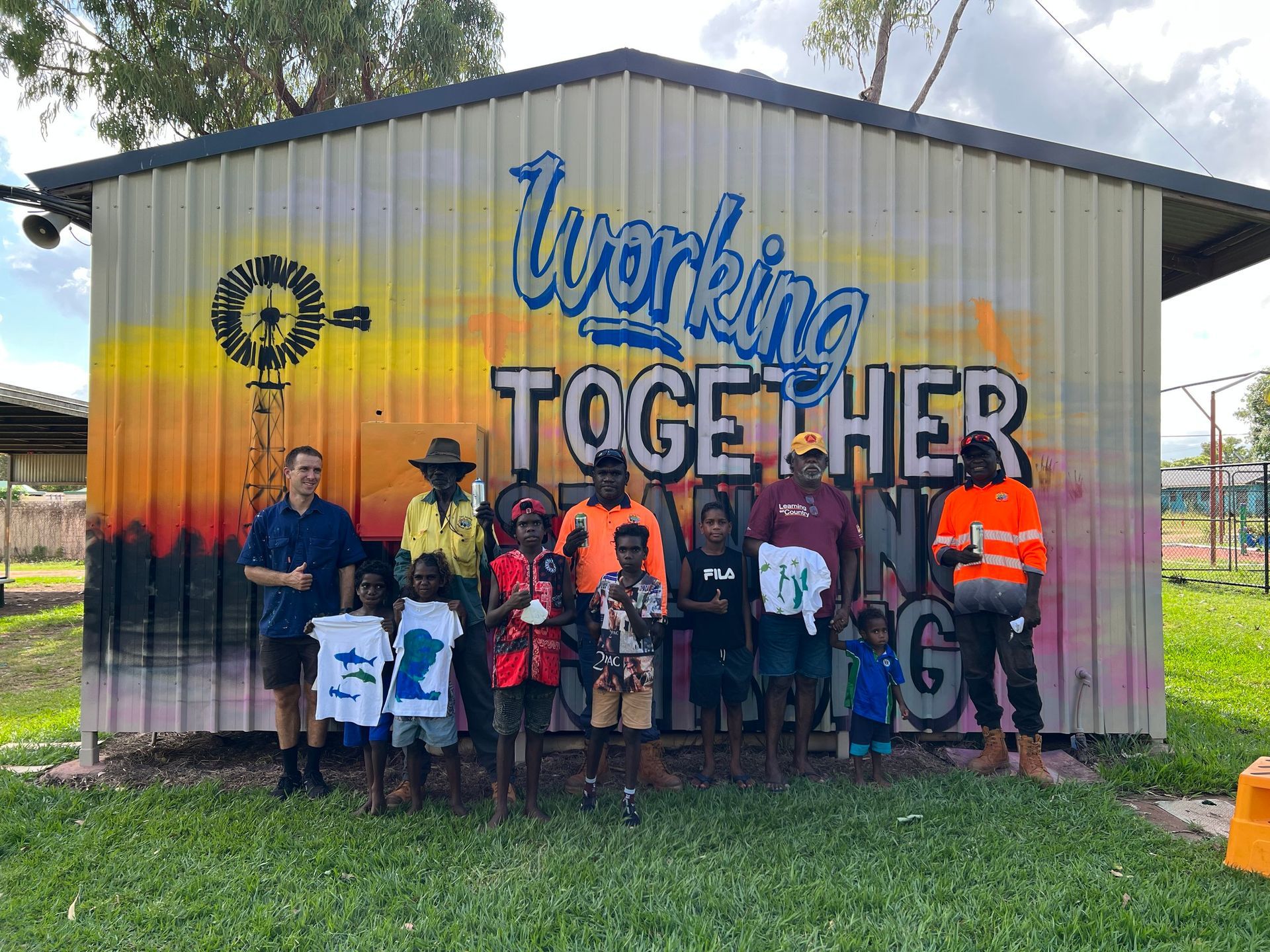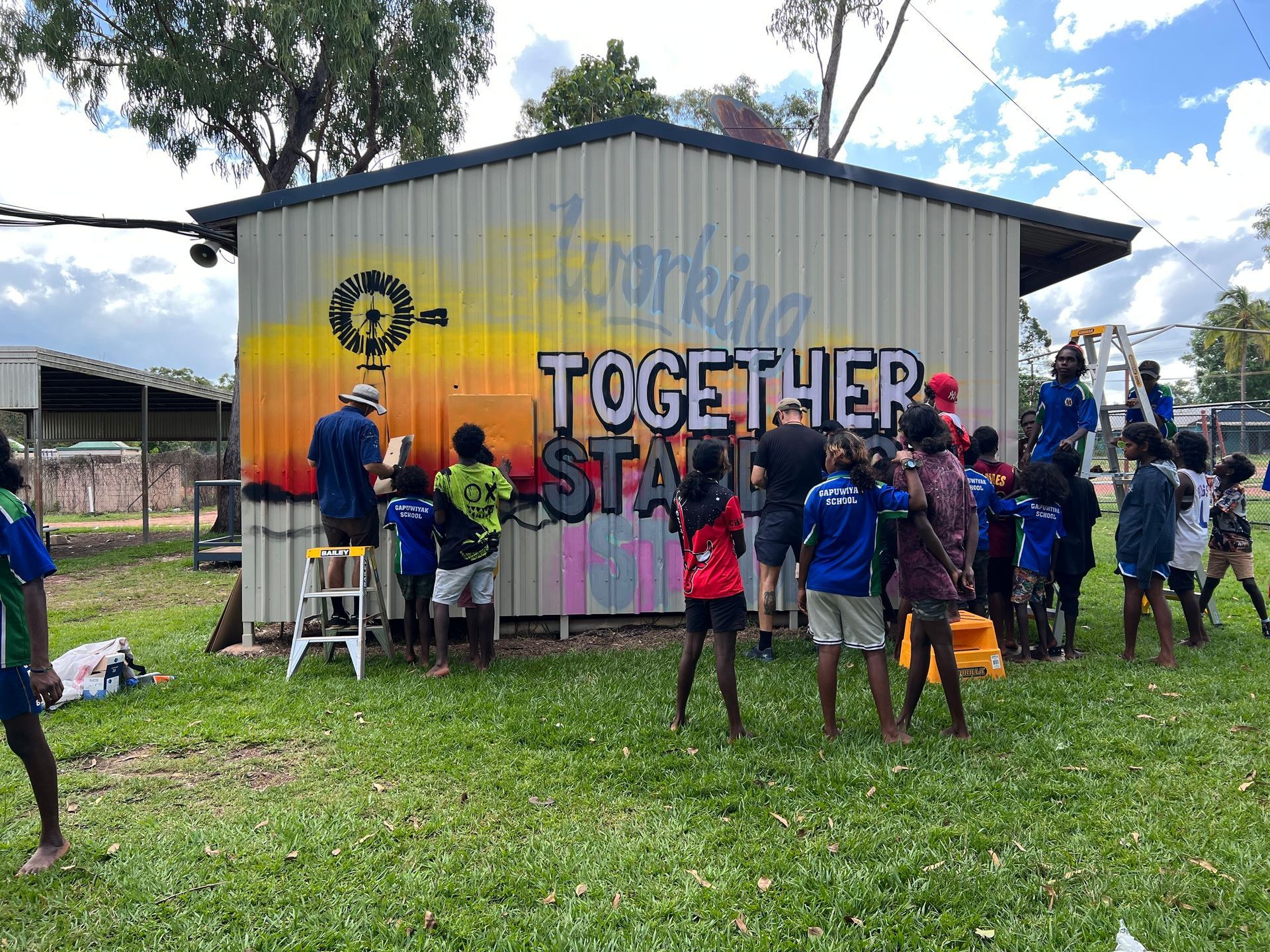 As part of community consultations in Gapuwiyak, the community now owns the newest mural in the region. A stunning piece of community art, the mural is a true reflection of the how both Yolngu and Balanda have worked together in the past to support and strengthen to the communities. The mural proudly reads, “Working Together, Standing Strong” whilst featuring the windmill that was built by both Yolngu and Balanda during the early-mission days - a theme that was raised by the Gapuwiyak Local Authority for their community.