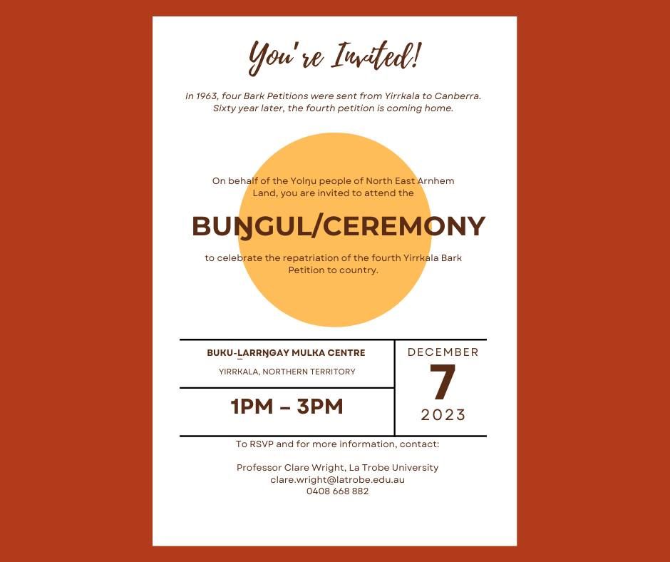 Sixty years later, the fourth Petition is returning to Yirrkala. A ceremony to celebrate the repatriation is scheduled for December 7, 2023, from 1 pm to 3 pm at the Buku-Larrnggay Mulka Centre, Yirrkala.